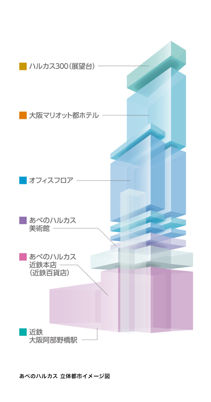 「あべのハルカス」は延床面積が約31万㎡で、鉄道のターミナルと直結し、百貨店・ホテル・オフィスなど近鉄グループの主要事業を集積された立体都市です。