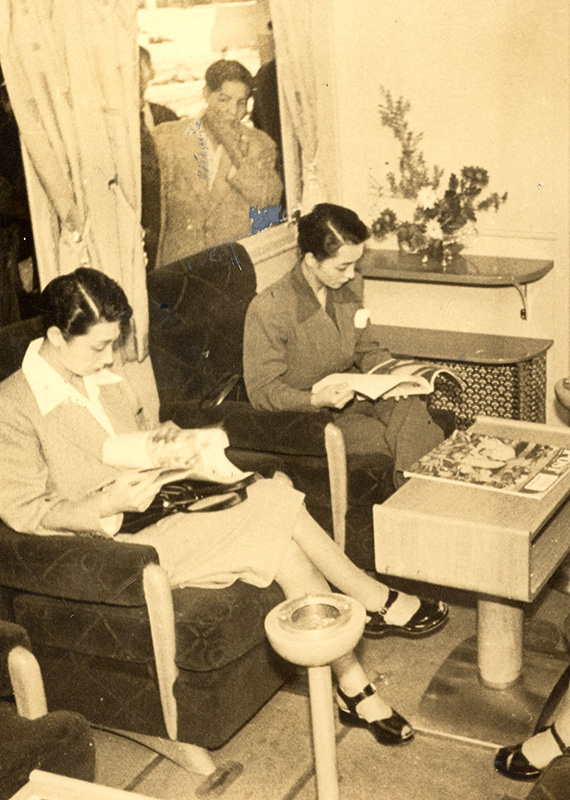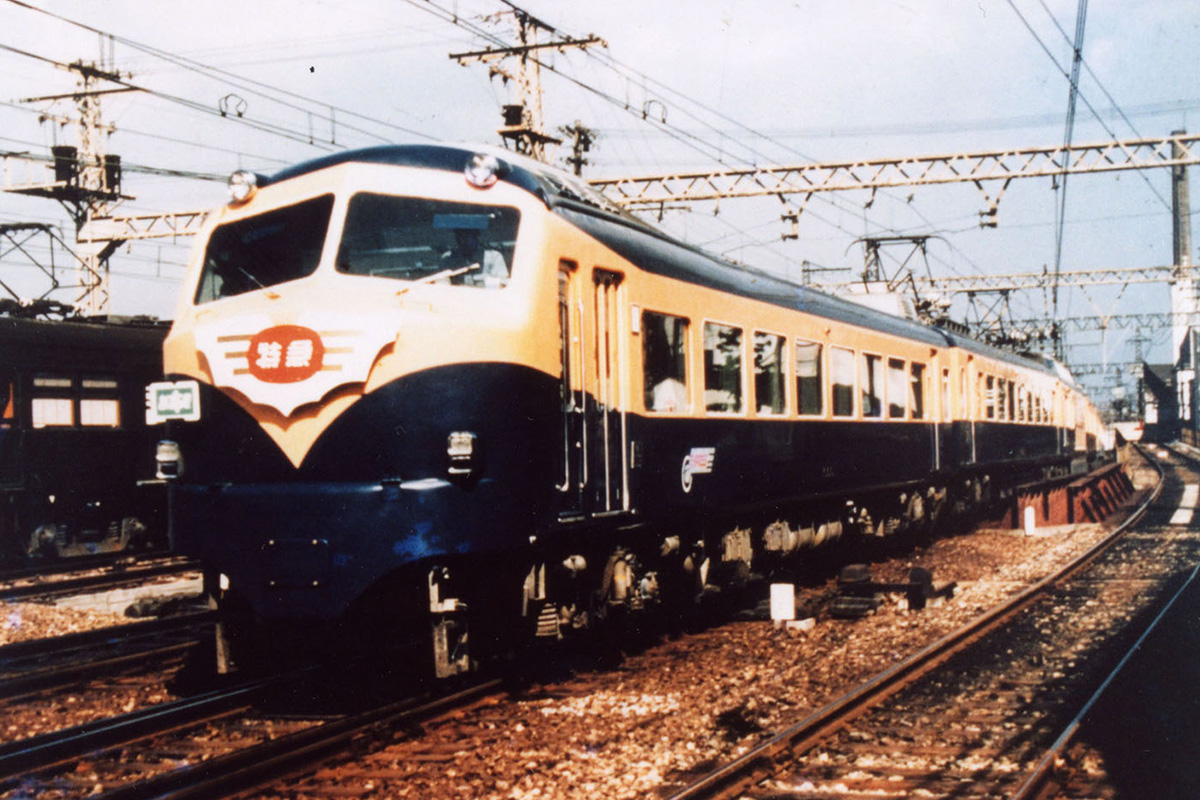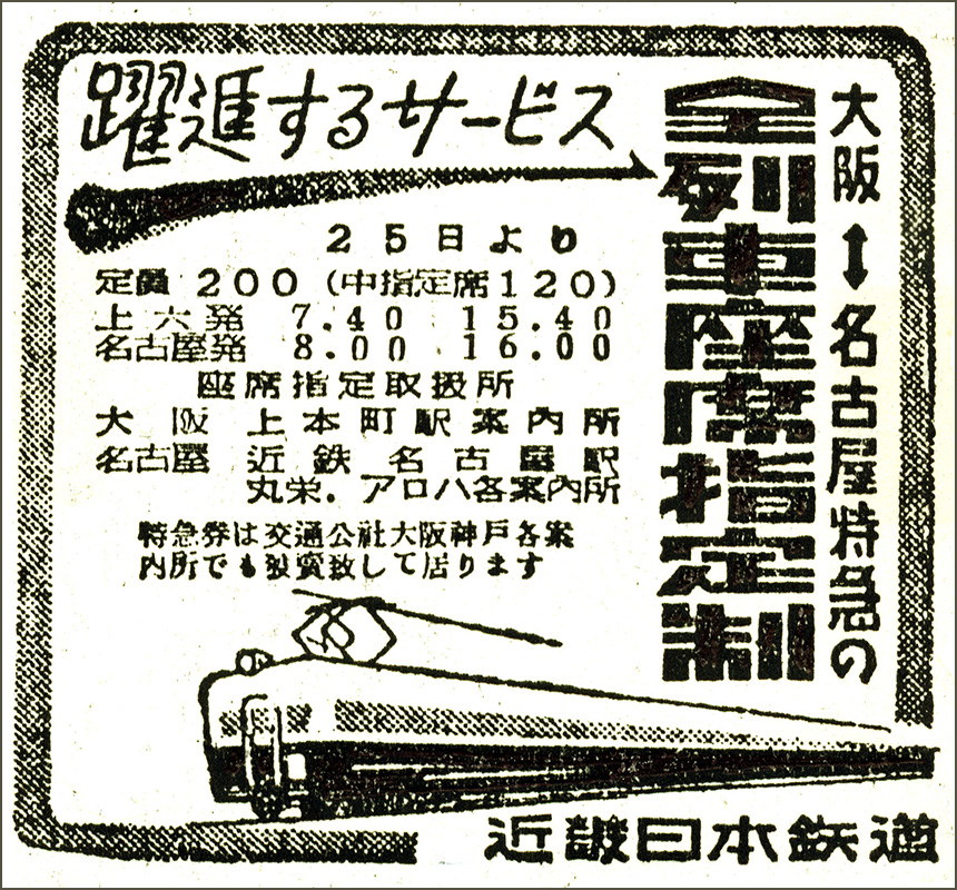 1947年10月8日、近鉄で初めての有料特急が走行しました。上本町-近畿日本名古屋(現:近鉄名古屋)間を伊勢中川で乗り換えて4時間3分で結ぶものであり、民鉄初となる座席定員制としました。戦後の混乱期における鉄道の旅客輸送は、車両は資材不足で破損修理も不十分であり、また車内も大変混雑していることが常態となっていました。そうした時代の中にあって近鉄は、小さな子どもと一緒でも安心して座って旅行できる特急の運行を開始し、大量輸送だけではない鉄道の役割や快適な輸送サービスの在り方、それを追究していく自社の姿勢を強く示したのです。1949年から座席指定制としましたが、当時の広告にある「躍進するサービス」というコピーにも近鉄が目指す鉄道事業の姿勢を表しました。