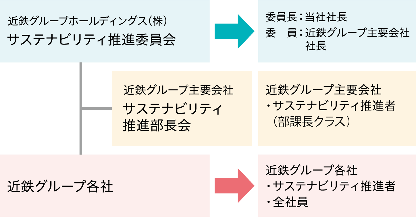 当社は、お客さま、地域社会、株主、取引先、従業員等ステークホルダーとの信頼関係を築き、長期的な視点での社会課題解決と企業価値向上のため、サステナビリティ推進委員会を設置しています。サステナビリティ推進委員会では、当社社長を委員長として、当社役員および近鉄グループ主要会社の社長により構成し、サステナビリティを巡る諸課題への取組み方針等を検討しています。