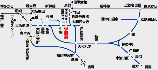 近鉄「京都」駅から急行 … 約45分(近鉄「大和西大寺」駅のりかえ)