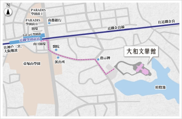 搭乘近鐵奈良線至《學園前》站下車,自南出口徒步大體7分鐘