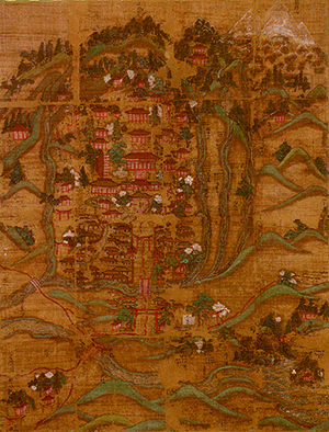 本展では、重要文化財「高野山水屏風」(京都国立博物館)や同じく重要文化財「園城寺境内古図」(園城寺蔵)など、中世の人々が見ていた境内の風景を描く大作を中心に、関西初公開となる会津の慧日寺を描く室町時代の「慧日寺絵図」(恵日寺蔵)や、丹波一宮として古い歴史を誇る亀岡市の出雲大神宮伝来の「出雲神社絵図」(出雲大神宮蔵)などをそろえました。