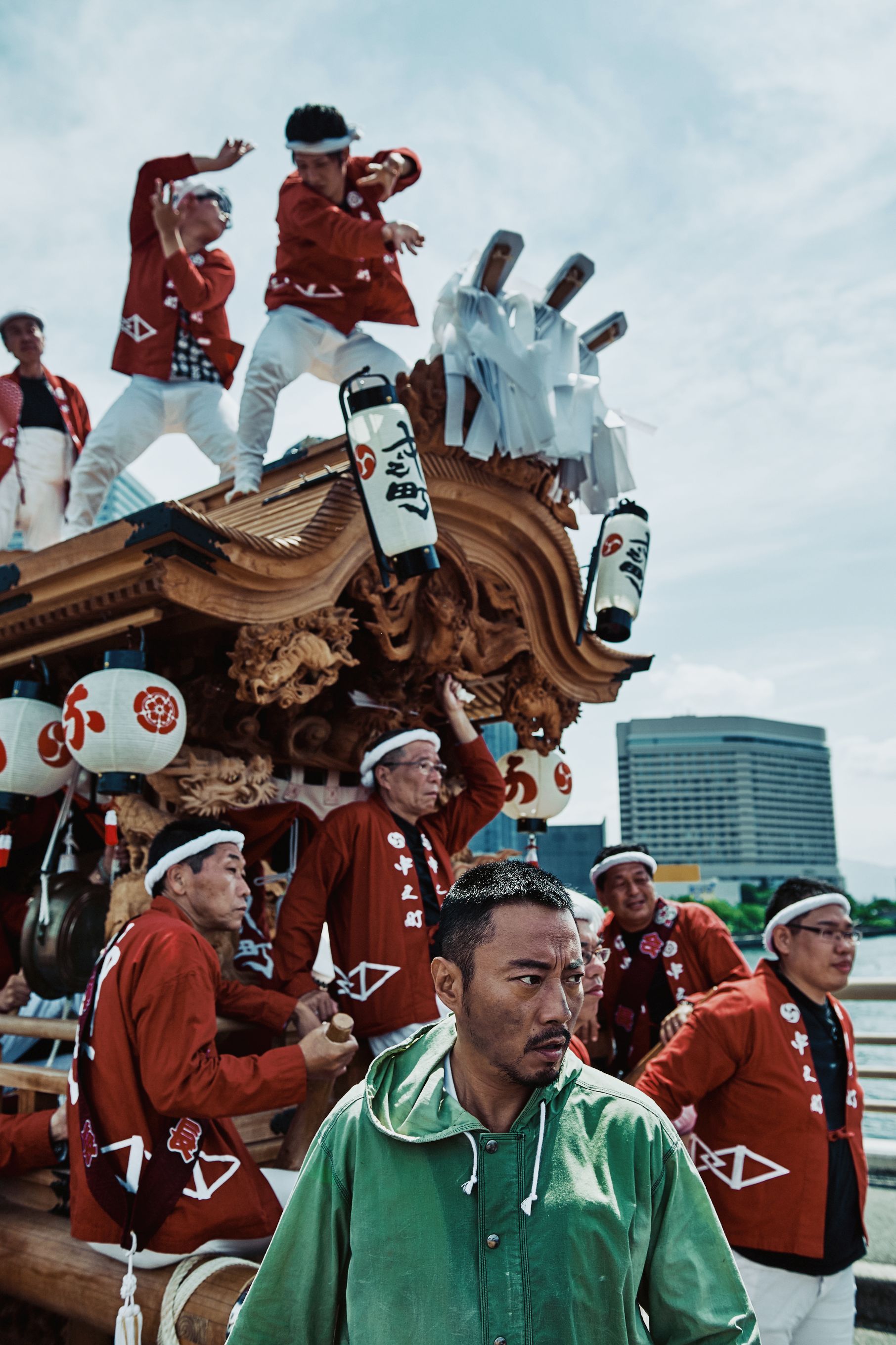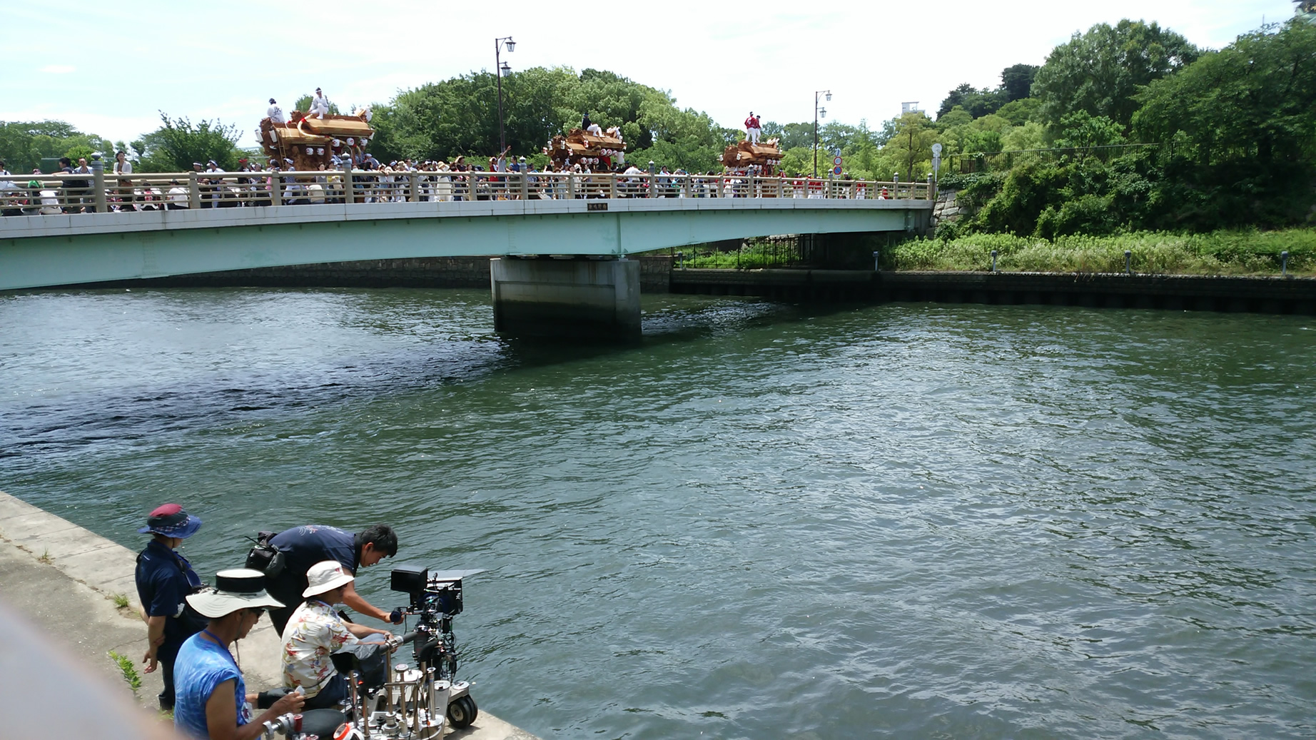 在中之岛 堂岛川,利用水上快艇进行了惊心动魄的动作摄影。这里举行的乘船观光等游览活动,可以欣赏到不同于平时的大阪风光。
