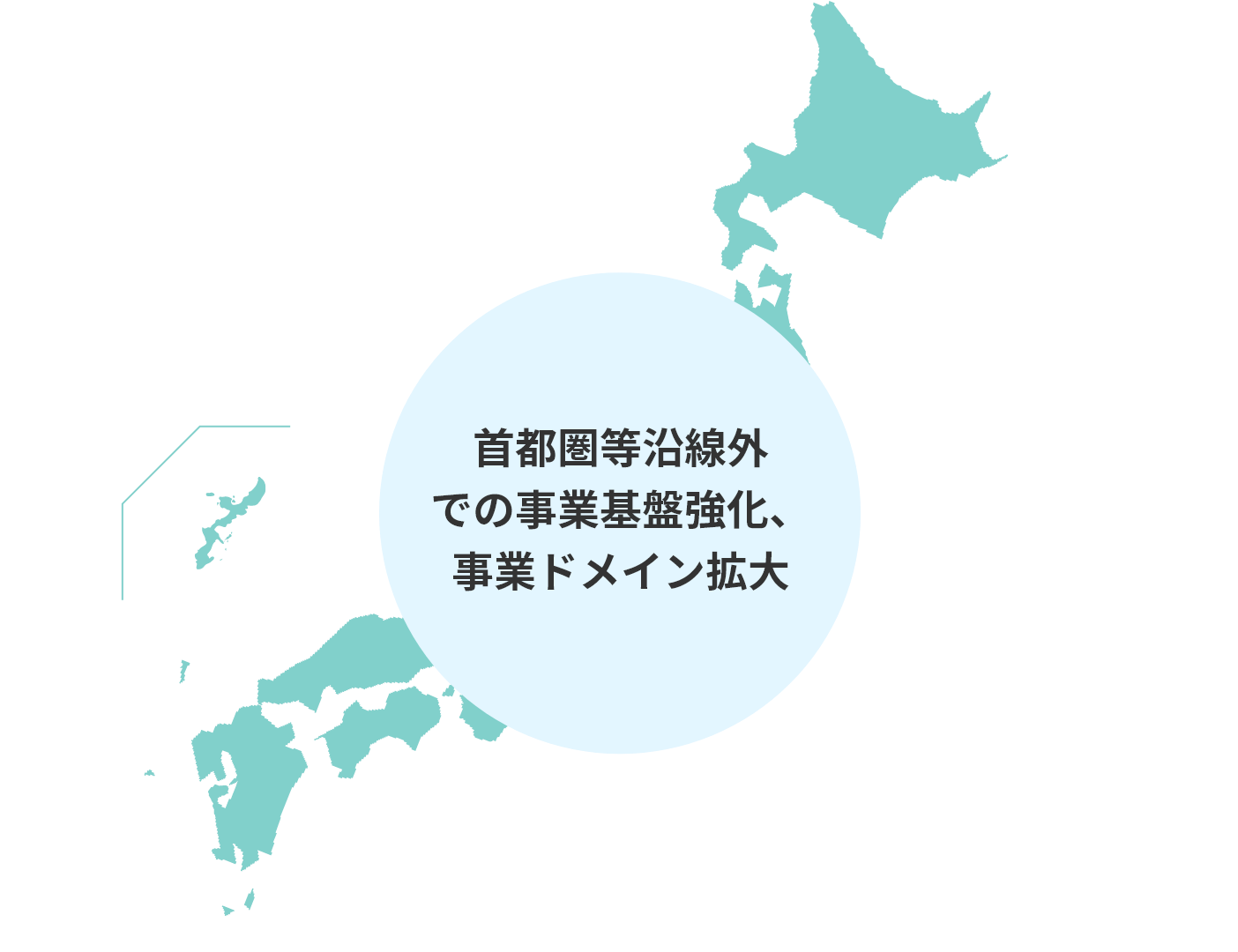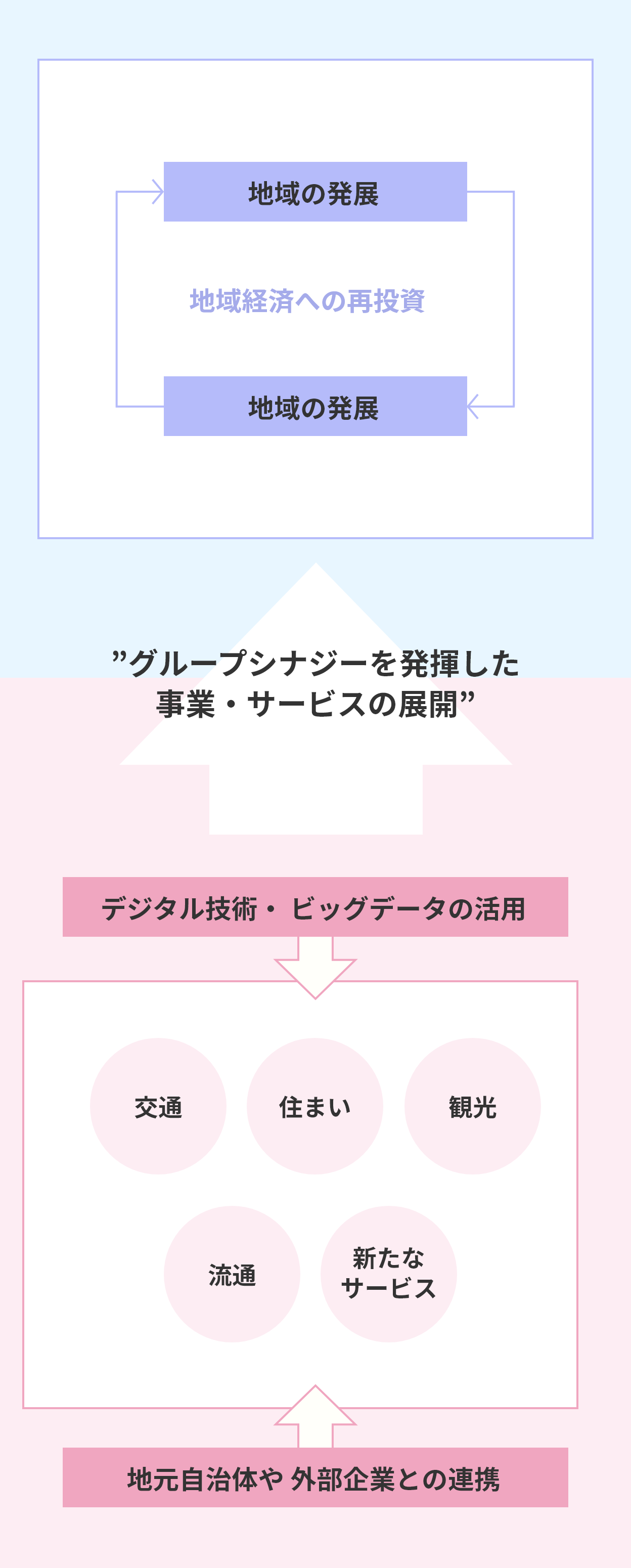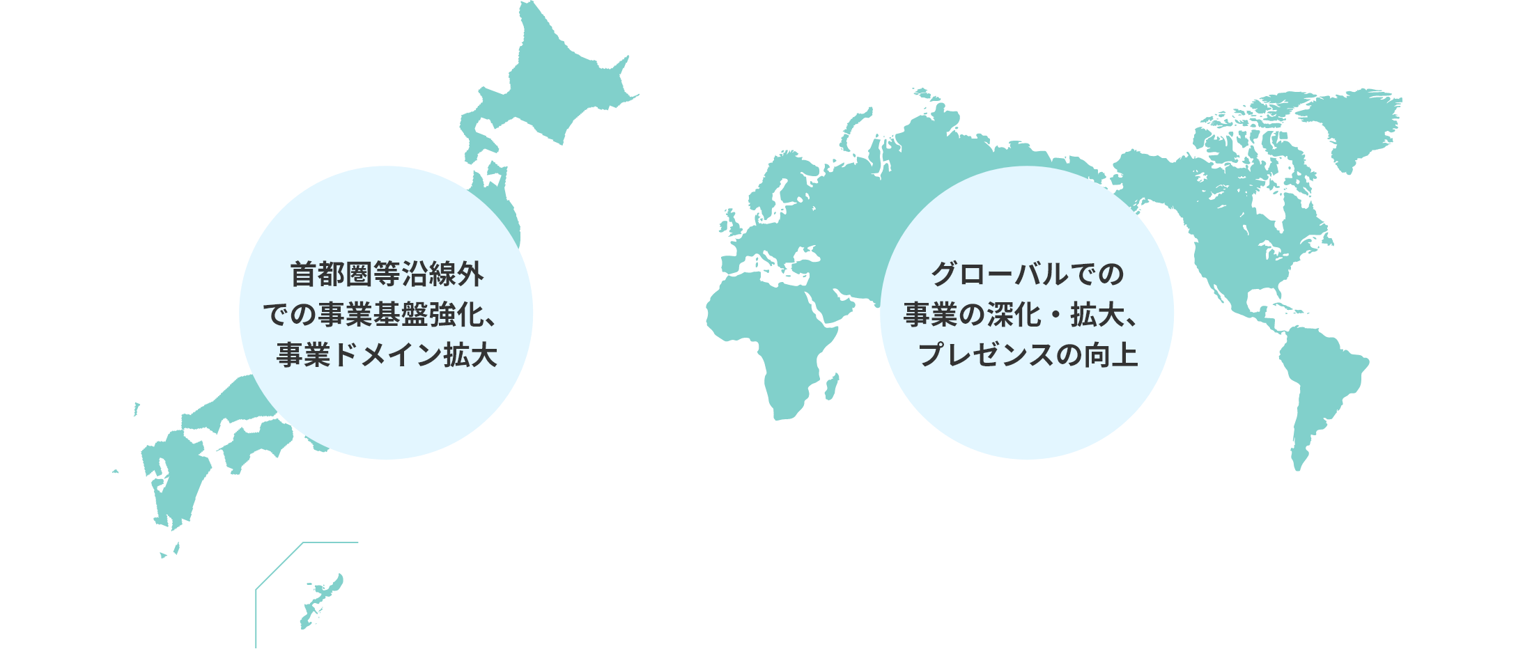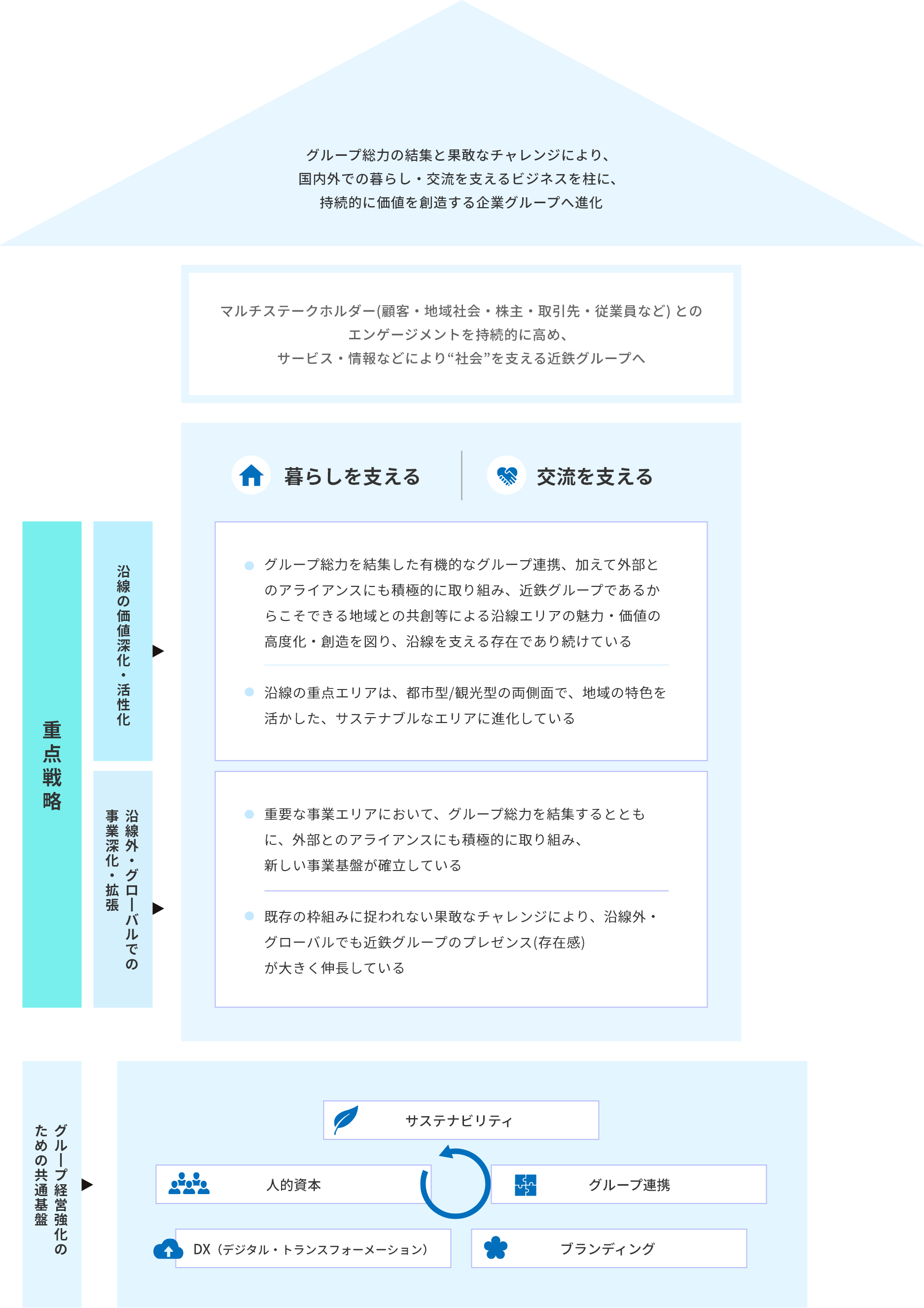 これまでに培った信頼というブランドや成長余地の大きい事業群などを活かし、中長期的に、沿線、沿線外・グローバルでの重点戦略を着実に実行し、あわせて、サステナビリティ、人的資本、DXやグループ連携など、グループ経営強化のための共通基盤の整備も推進していきます。